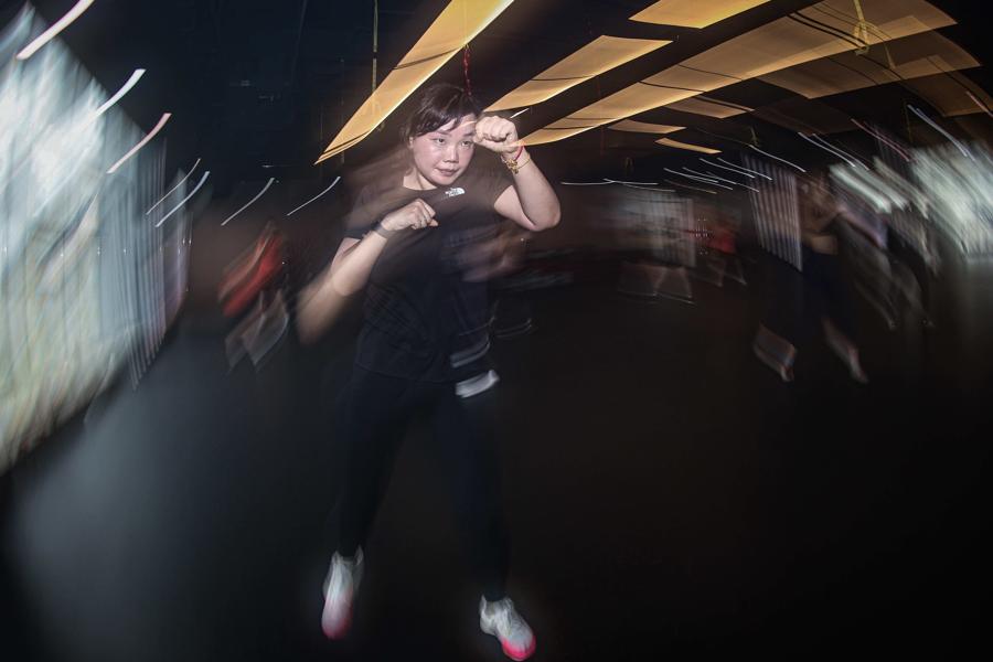 上海城市運動中心的團課室內,女性消費者正在教練的帶領下揮汗如雨