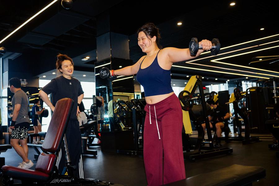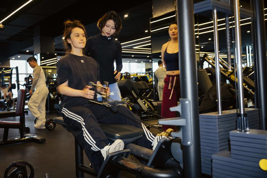 上海城市運動中心內,女性消費者在教練的指導下正在進行力量訓練