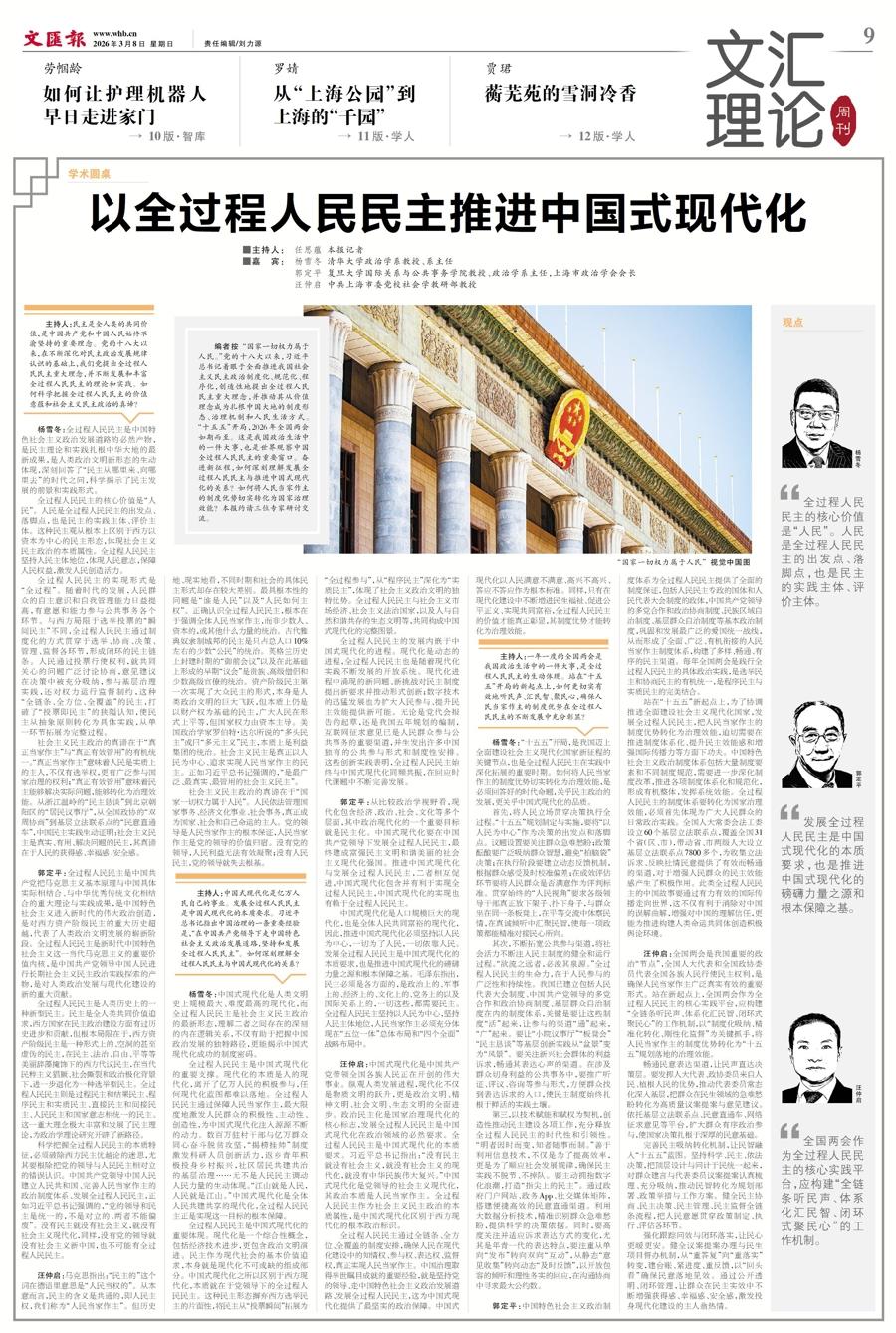 編者按“國家一切權力屬於人民。”黨的十八大以來,習近平總書記着眼於全面推進我國社會主義民主政治制度化、規範化、程序化,創造性地提出全過程人民民主重大理念,並推動其從價值理念成爲紮根中國大地的制度形態、治理機制和人民生活方式。“十五五”開局,2026年全國兩會如期而至。這是我國政治生活中的一件大事,也是世界觀察中國全過程人民民主的重要窗口。奮進新徵程,如何深刻理解發展全過程人民民主與推進中國式現代化的關係?如何將人民當家作主的制度優勢切實轉化爲國家治理效能?本報約請三位專家研討交流。