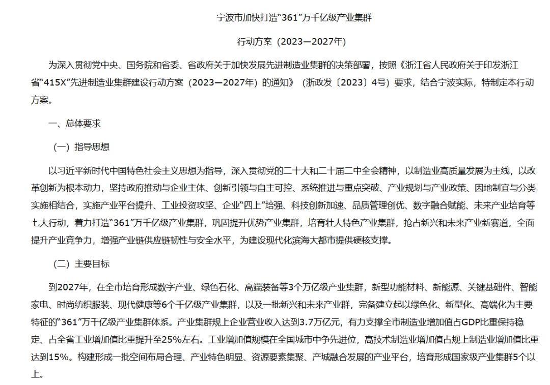 寧波官方計劃構建“361”現代化產業體系,到2027年,在全市培育形成3個萬億級產業集羣、6個千億級產業集羣以及1批新興和未來產業羣。