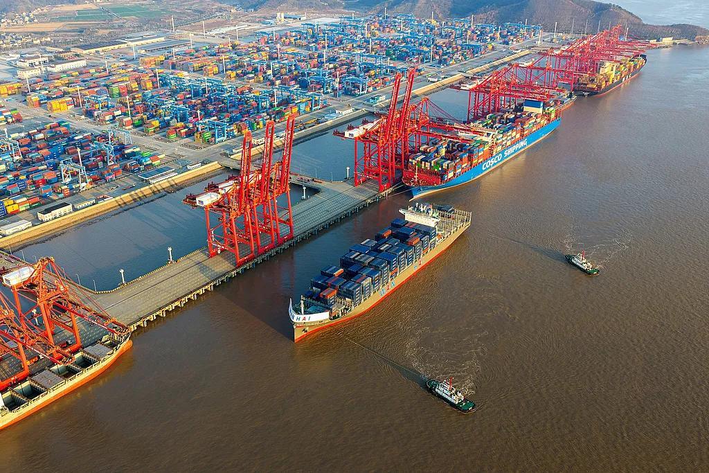 寧波舟山港大型集裝箱輪正進行裝卸作業