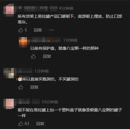 事件發酵後,網友紛紛熱議並給出建議。有網友提議“貨架上易拉罐口朝下、底部朝上擺放,防止口部落灰”;也有網友呼籲改進包裝,“給易拉罐加個塑料蓋,像銀露八寶粥罐子一樣”,希望從源頭規避衛生隱患。