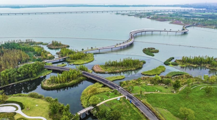 圖爲長三角生態綠色一體化發展示範區首個跨界湖泊濱水岸線生態修復項目。/文匯報記者張伊辰攝