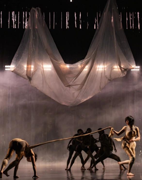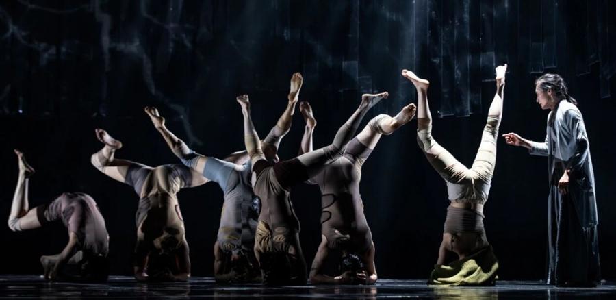 韓江在小說中思考的不止是女性面對丈夫或父親的困境,英惠掙扎於從一個充斥着強迫和戕害的秩序中脫離,所以她對姐姐說“所有的樹是手足”,她倒立着向土地紮根、變成一棵樹。舞臺上,一條條膠帶從高處垂下,圍成一圈,這看起來透明但真實存在的“界限”是英惠不惜一切要逃離的困城,她要掙脫這個不合理的殘酷秩序。莊稼昀、江帆和這羣舞者的勇氣在於,他們觸達了小說《素食者》的精神氣質,用舞蹈的語言、舞蹈的方式表達了他們對同一主題的思考,即使小說的原文本作爲旁白出現,既不是文字解釋了舞蹈,也不是舞蹈演示了文字,這是舞蹈和小說、中國的年輕創作者和諾貝爾文學獎作者之間完成一場對話。