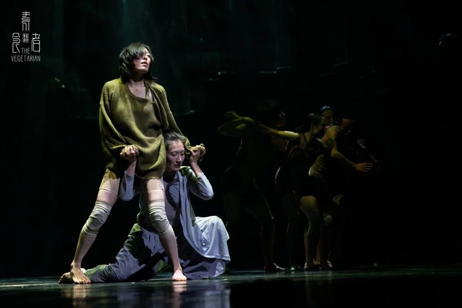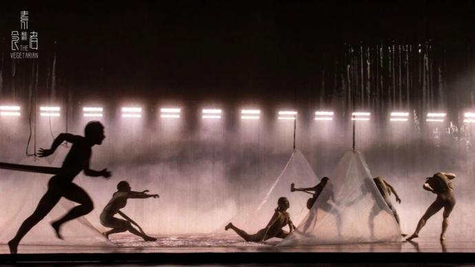 舞者出現在昏暗的舞臺上,他們的服裝和肢體造型看起來既是人又是樹,既是沒有生命力的血肉,又是瘋狂生長的森林。舞蹈劇場《素食者》開始於在小說中沒有正面描述的英惠的夢境,她做了這個怪誕恐怖、無法對他人言說的夢,夢醒後決定成爲素食者,她從拒絕喫肉,逐漸拒絕加入“正常生活”,直到拒絕進食,她的身體變形成爲植物般的存在。