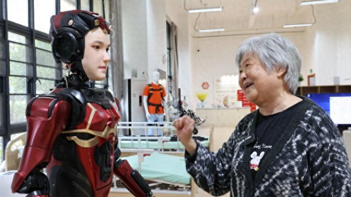 在深圳市養老護理院,一名老人與人形機器人“夏瀾”互動。新華社圖
