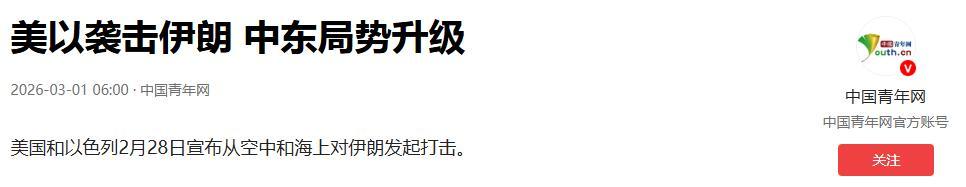 美以襲擊伊朗 中東局勢升級.2026-03-01 06:00·中國青年網.