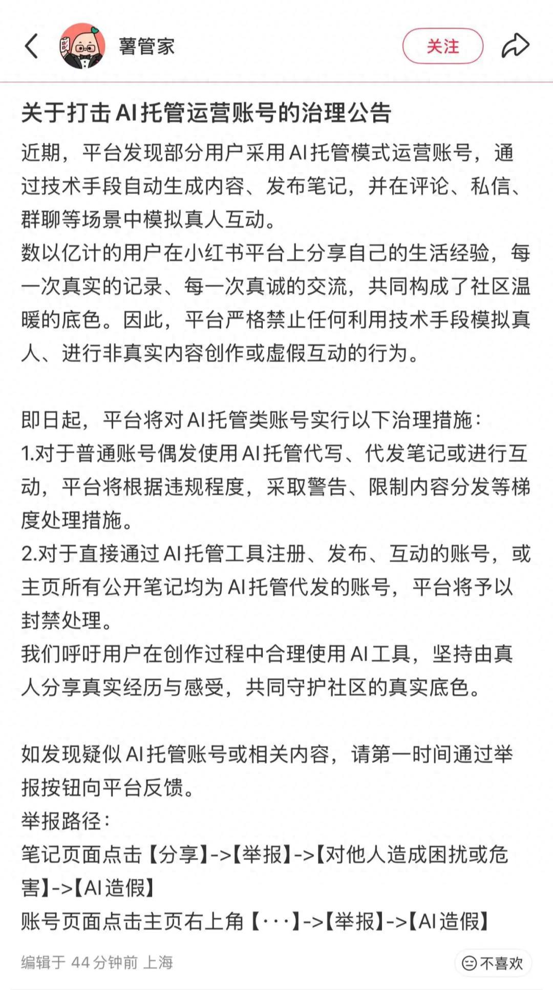 小紅書最新公告:對於直接通過AI託管工具註冊、發佈、互動的賬號,或主頁所有公開筆記均爲AI託管代發的賬號,平臺將予以封禁處理