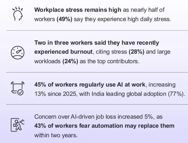 Manpower Group發佈的《2026全球人才晴雨表》顯示,過去一年,定期使用AI的打工人同比增長了13個百分點,達到45%。