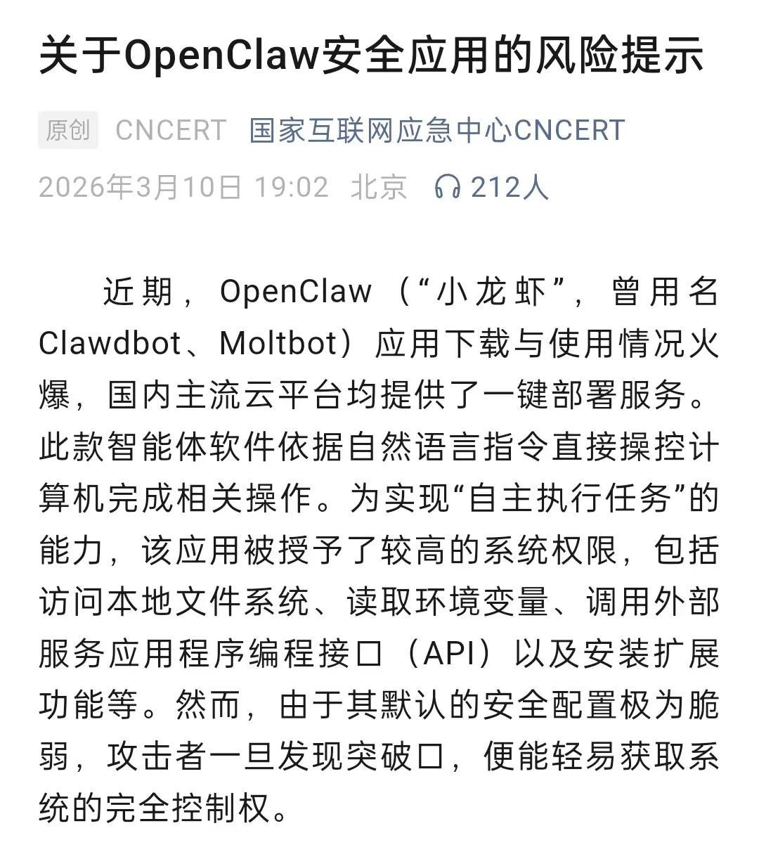 3月10日,國家互聯網應急中心發佈《關於OpenClaw安全應用的風險提示》,其中提及,由於OpenClaw智能體的不當安裝和使用,已經出現了提示詞注入、誤操作、功能插件投毒、安全漏洞等嚴重安全風險。