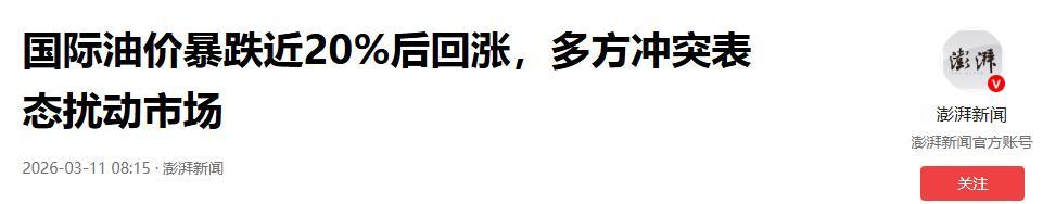 國際油價暴跌近20%後回漲,多方衝突表態擾動市場.2026-03-11 08:15·澎湃新聞.