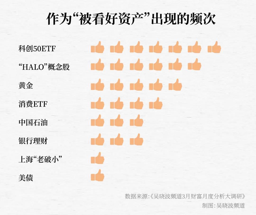 另外,從排序的結果看,作爲“被看好資產”,出現頻次最高的,是科創50ETF,出現了7次;“HALO”概念股緊隨其後,出現了6次;消費ETF、中國石油股票分別出現4次、3次。