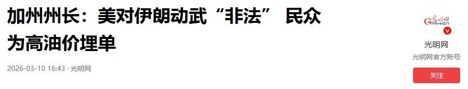 加州州長:美對伊朗動武“非法” 民衆爲高油價埋單.2026-03-10 16:43·光明網.
