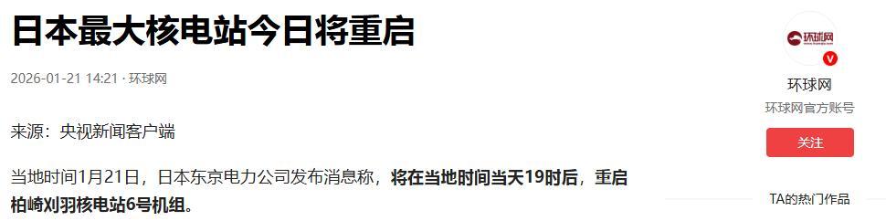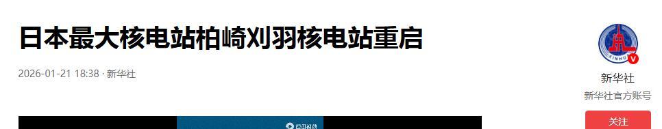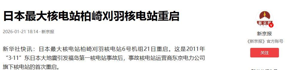 日本最大核電站柏崎刈羽核電站重啓.2026-01-21 18:14·新京報.