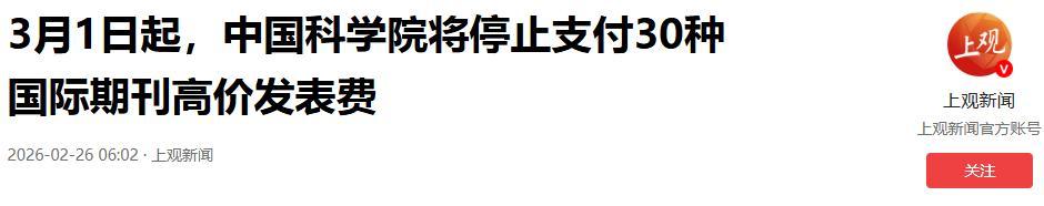 3月1日起,中國科學院將停止支付30種國際期刊高價發表費.2026-02-26 06:02·上觀新聞.