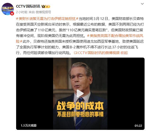 據@CCTV國際時訊: 當地時間3月12日,美國財政部長貝森特在接受英國天空新聞臺採訪時表示,根據最近公佈的數據,美國不到兩週已經爲打擊伊朗花費了110億美元,雖然“110億美元確實是筆鉅款”,但美國財政預案已留有緩衝空間,現階段美國仍無需爲此而擔憂。