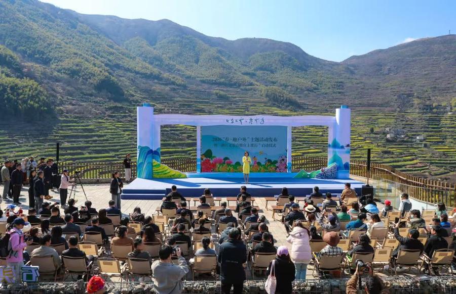 3月12日,2026“春·趣戶外”主題活動發佈暨“浙江文旅宣推官上虞行”啓動儀式,在“全國十大賞花勝地之一”上虞區嶺南鄉覆卮山舉行。萬畝油菜花海鋪展千年梯田,萬年石浪靜臥山間,百年古村遊人如織,爲這場春日文旅盛宴拉開序幕。