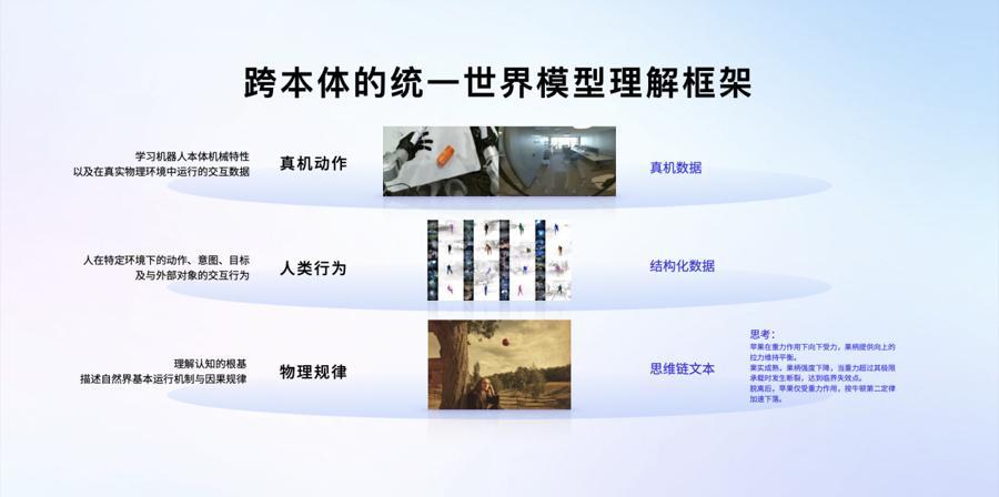 當前,具身智能行業深陷數據稀缺割裂、長時序交互不足、部署成本高昂等困境,傳統生成式模型多爲“大模型改款”,缺乏對物理世界的深度認知。而Kairos 3.0-4B從架構底層重構設計,以自然界物理規律與因果規律爲根基,融合機器人真機交互、人類行爲結構化與思維鏈文本三類關鍵數據,打破多元數據壁壘,實現了“理解世界、生成世界、預測世界”的一體化能力,讓模型真正做到“知其然更知其所以然”。