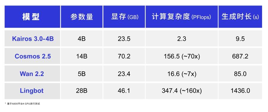 輕量化與高效能的結合,讓Kairos 3.0-4B打破“大參數=高性能”的行業固有認知。該模型以4B輕量化參數實現23.5GB顯存佔用,遠低於同類競品,完美適配端側實時推理需求。在A800 GPU Benchmark評測中,其推理速度較Cosmos 2.5提升72倍,完成10秒生成任務僅耗時9.5秒,較Lingbot快約151倍;同時率先實現雲側1:1實時推理,適配英偉達、沐曦等多款GPU,大幅降低部署門檻。