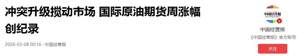 衝突升級攪動市場 國際原油期貨周漲幅創紀錄.2026-03-08 00:16·中國經營報.