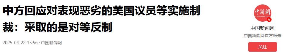 中方回應對錶現惡劣的美國議員等實施制裁:採取的是對等反制.2025-04-22 15:56·中國新聞網.