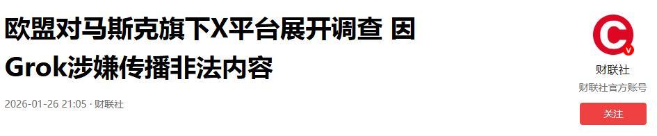 2026年1月,歐盟已經對馬斯克旗下社交平臺X的聊天機器人Grok,展開了專項調查。
