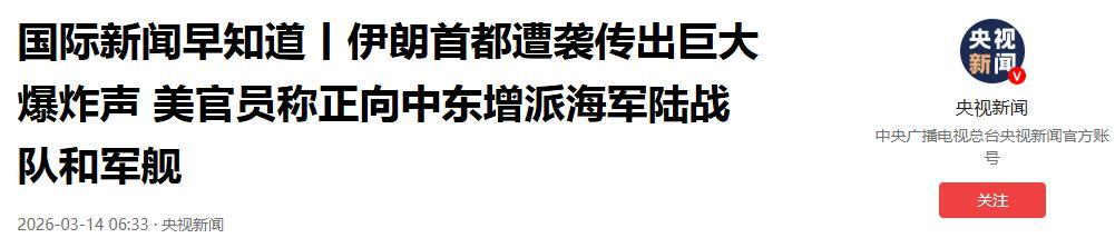 國際新聞早知道丨伊朗首都遭襲傳出巨大爆炸聲 美官員稱正向中東增派海軍陸戰隊和軍艦.2026-03-14 06:33·央視新聞.