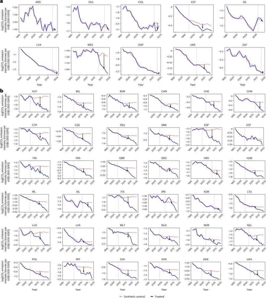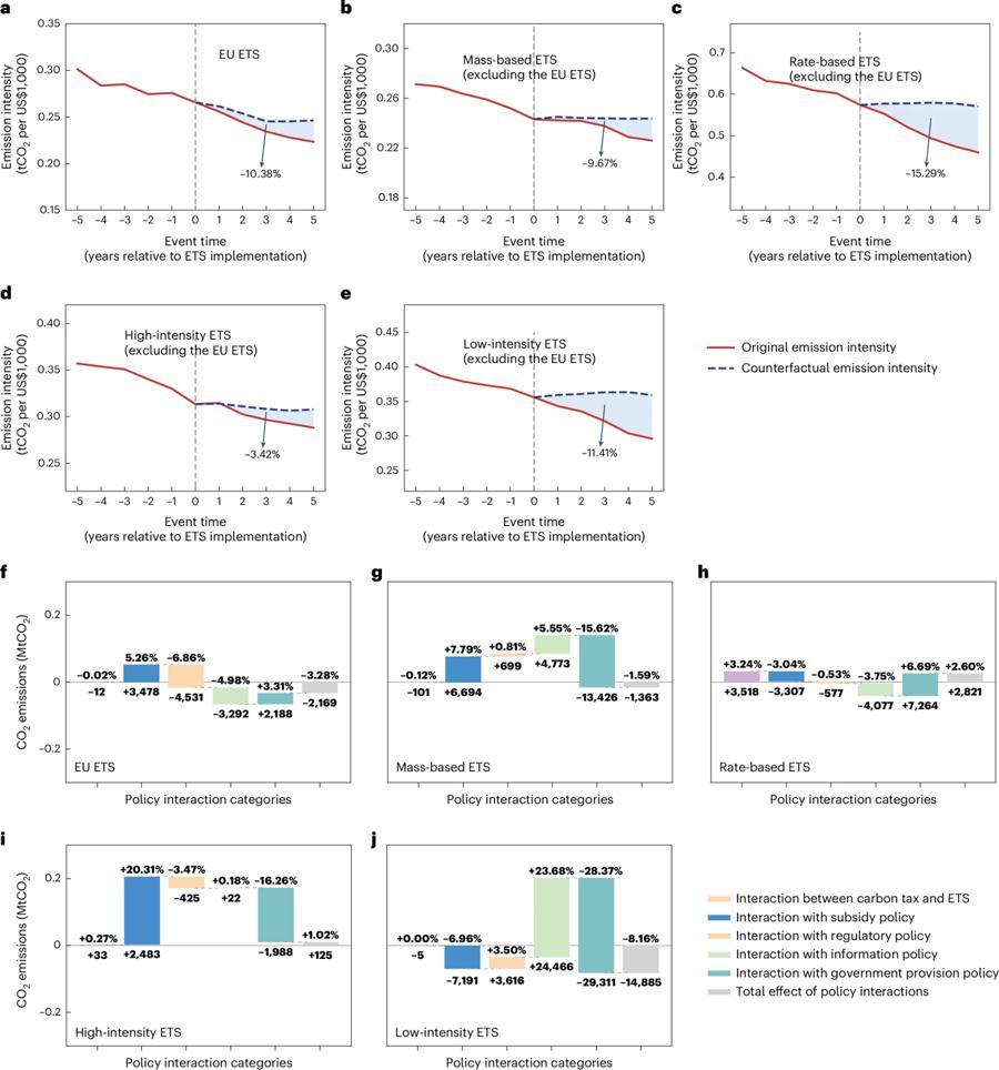 團隊研究發現,在全球平均水平下,碳排放權交易體系(ETS)和碳稅分別能使排放強度降低約15.4%和8.5%。然而這一效果在不同政策組合下表現出顯著差異。