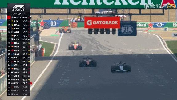 衝刺賽中,杆位發車的梅賽德斯車手拉塞爾以第一名衝線