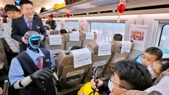 向“新”而行,助力旅客“走得好”。在“西子號”上,“編外乘務員”機器人“福興”幫助旅客查詢列車時刻、換乘路線,它還與旅客互動,提供到站天氣、旅遊景點等信息。從上海回寧波的方女士和它握了握手:“春運回家路上很驚喜,科技發展越來越貼近我們的生活。”