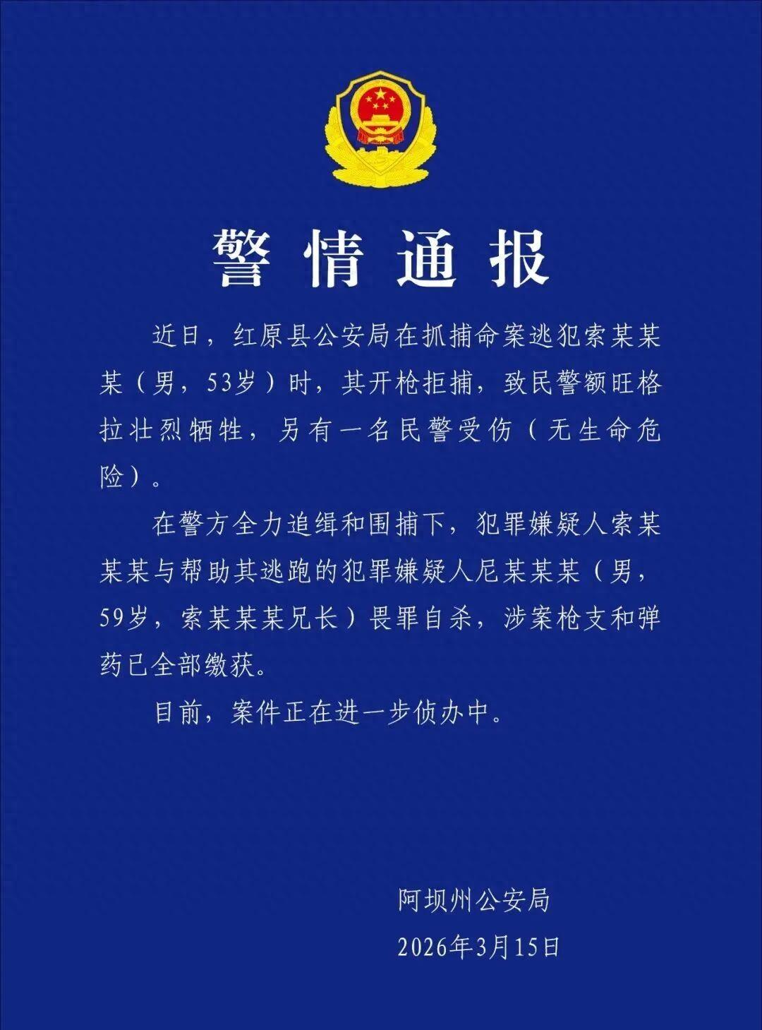 四川省阿壩州公安局3月15日發佈警情通報稱,近日,紅原縣公安局在抓捕命案逃犯索某某某(男,53歲)時,其開槍拒捕,致民警額旺格拉壯烈犧牲,另有一名民警受傷(無生命危險)。