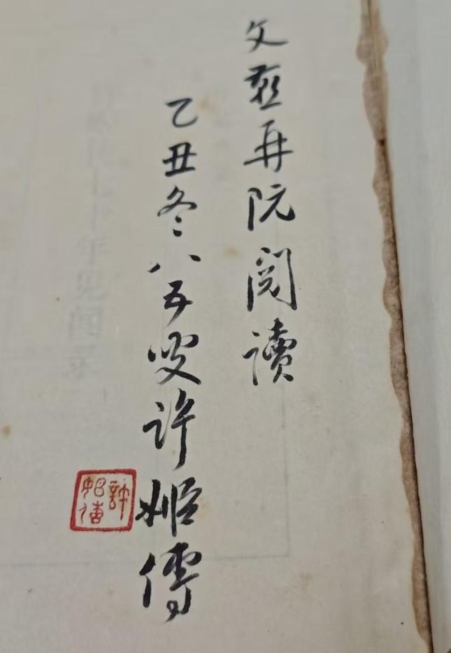 其二爲《許姬傳七十年見聞錄》(中華書局1985年版),爲作者毛筆簽名本,題“文燕再阮閱讀 乙丑冬八五叟許姬傳”。書中記敘,許姬傳外祖父乃清末維新派領袖徐致靖。受贈者徐文燕,實爲徐致靖玄孫。徐致靖育有兩子一女,其女玉輝即許姬傳之母,長子仁鑄有孫名振棨,振棨有二子,長子爲文燕。簽名中“再阮”二字,經請教方家得知,“阮”,爲侄子代稱(出自晉代“竹林七賢”之阮籍、阮咸叔侄典故),“再阮”,則指侄孫。徐文燕實爲許姬傳的表侄孫,故稱“再阮”。書中《梅邊瑣記》內《凌霄漢閣與袁世凱》一文之按語亦提到:“振棨到北京,帶了他的兒子徐文燕、徐文煒來見我。”與此完全吻合。捧讀這本簽名本,彷彿聽一位耄耋老人在耳邊細數家族往事,字裏行間都是歲月的溫度。墨跡如人,溫然可親。