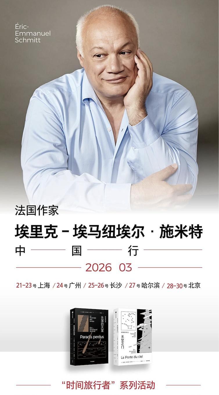 ▷法國作家埃裏克-埃馬紐埃爾·施米特即將開啓中國行。第五屆法國龔古爾文學獎中國之選將於2026年3月末舉行頒獎禮。本屆特邀嘉賓埃裏克-埃馬紐埃爾·施米特即將來華,從3月20日開啓他的中國之旅。擁有小說家、劇作家、導演和演員多重身份的他將前往上海、廣州、長沙、哈爾濱和北京,參加多場活動,與讀者們見面。