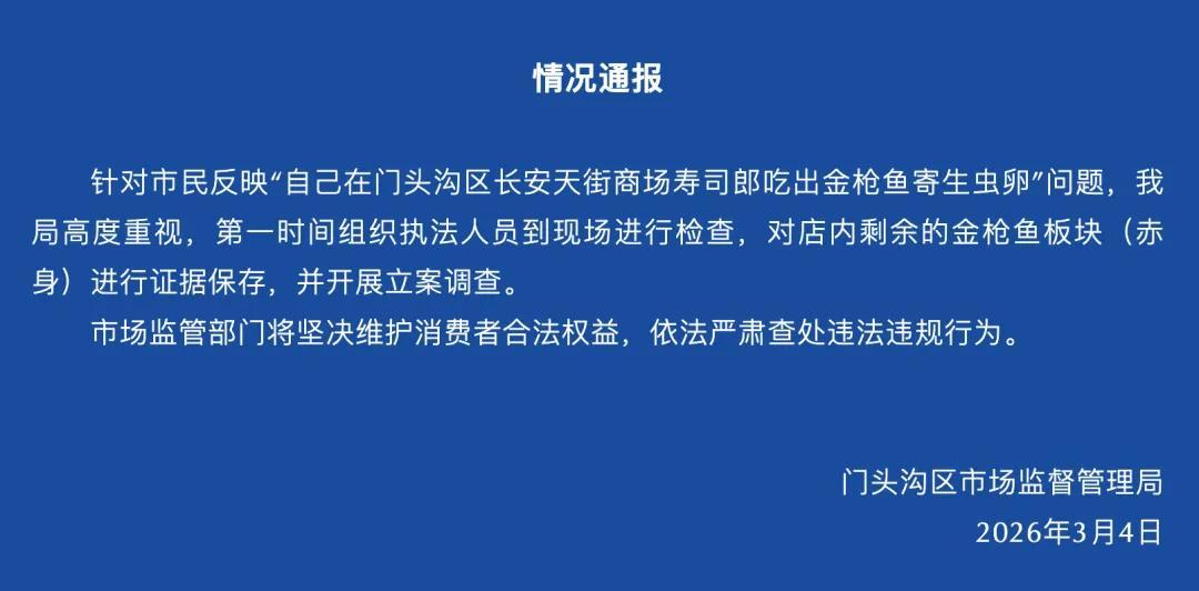 最觸目驚心的是3月6日《南方都市報》的報道,3月1日,有消費者在壽司郎北京門頭溝長安天街店發現金槍魚上有寄生蟲卵。如今該門店所在區域的市場監管局已對此正式立案調查。