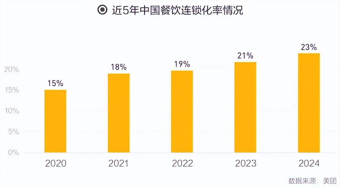 據《2025中國餐飲連鎖化發展白皮書》顯示,當前餐飲的連鎖化率已經提升至23%,不到十年幾乎翻了一倍。