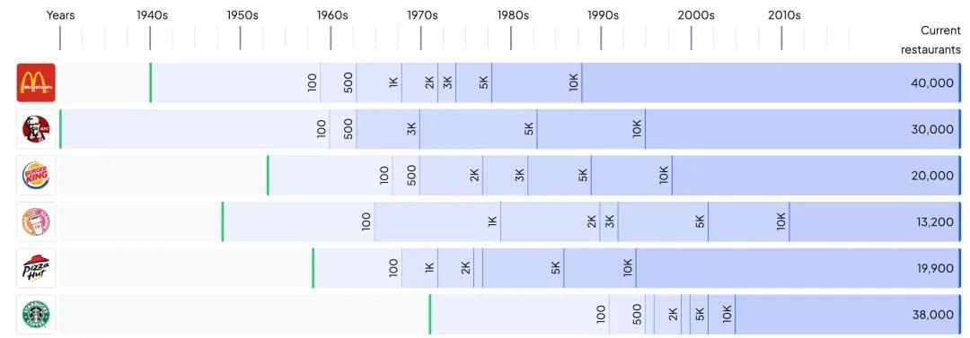 肯德基從創立到突破萬店用了43年,麥當勞用了33年,星巴克用了35年。而在中國,蜜雪冰城花了21年突破萬店,瑞幸用不到六年,庫迪甚至將這一週期壓縮到兩年以內。