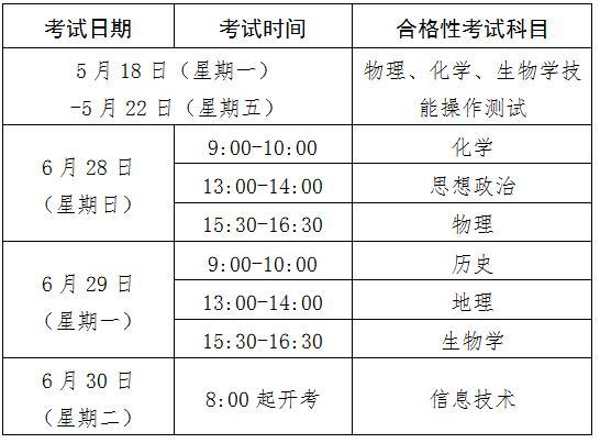 6月合格性考試設思想政治、歷史、地理、物理、化學、生物學和信息技術7門科目。其中,物理、化學、生物學3門科目含技能操作測試。高一年級在校生可報考的合格性考試科目爲:信息技術。高二年級在校生可報考的合格性考試科目爲:思想政治、歷史、地理、物理、化學、生物學、信息技術。在高一、高二年級未取得合格性考試合格成績的在校生可向其學籍所在學校申請報考相應科目的合格性考試。