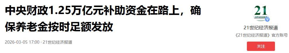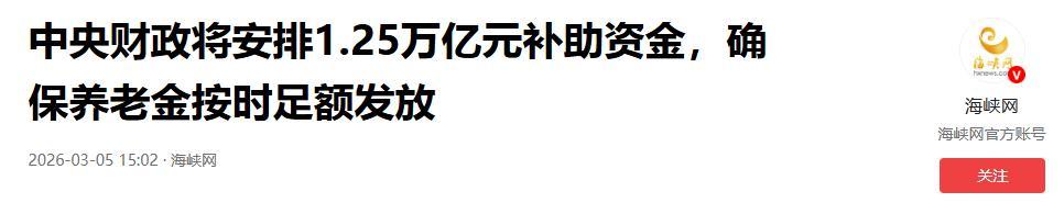 中央財政將安排1.25萬億元補助資金,確保養老金按時足額髮放.2026-03-05 15:02·海峽網.