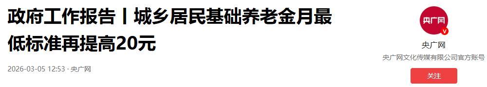2026年起,城鄉居民基礎養老金的全國最低標準,直接上調20元,從原來的每月143元,漲到每月163元。
