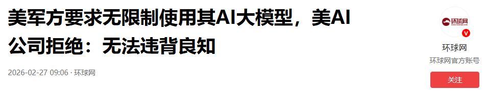 美軍方要求無限制使用其AI大模型,美AI公司拒絕:無法違背良知.2026-02-27 09:06·環球網.
