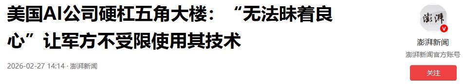 美國AI公司硬槓五角大樓:“無法昧着良心”讓軍方不受限使用其技術.2026-02-27 14:14·澎湃新聞.