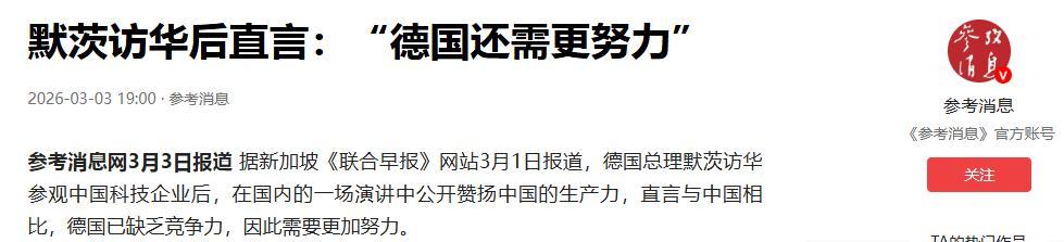 默茨訪華後直言:“德國還需更努力”.2026-03-03 19:00·參考消息.