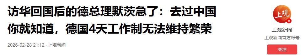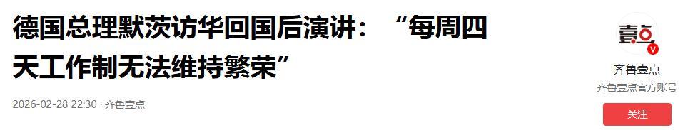 德國總理默茨訪華回國後演講:“每週四天工作制無法維持繁榮”.2026-02-28 22:30·齊魯壹點.