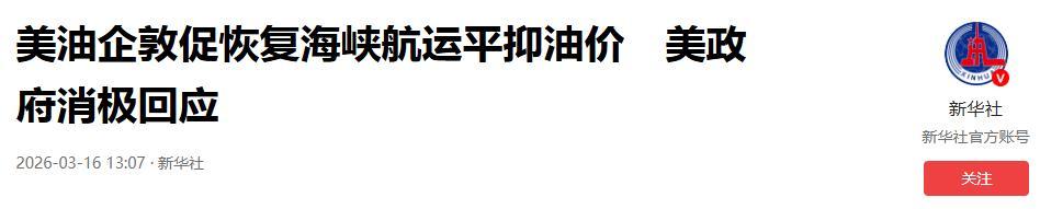 美油企敦促恢復海峽航運平抑油價 美政府消極回應.2026-03-16 13:07·新華社.