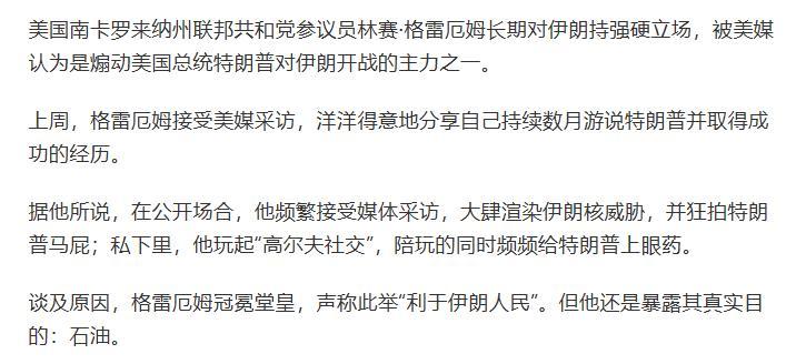 格雷厄姆極力鼓吹“打擊伊朗能載入史冊”,慫恿特朗普借海外軍事行動塑造“強人形象”,爲2026年中期選舉拉票。