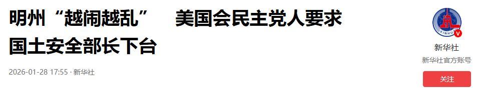 明州“越鬧越亂” 美國會民主黨人要求國土安全部長下臺.2026-01-28 17:55·新華社.