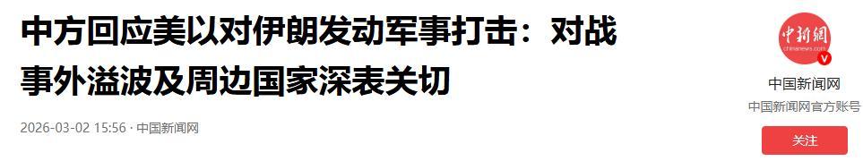 中方回應美以對伊朗發動軍事打擊:對戰事外溢波及周邊國家深表關切.2026-03-02 15:56·中國新聞網.