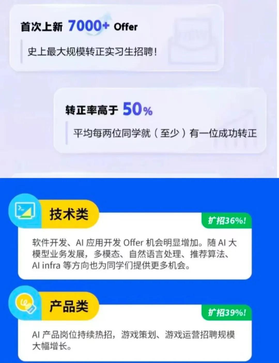 而字節跳動則開啓了史上最大規模轉正實習生招聘,提供7000餘個崗位,轉正率超過50%。
