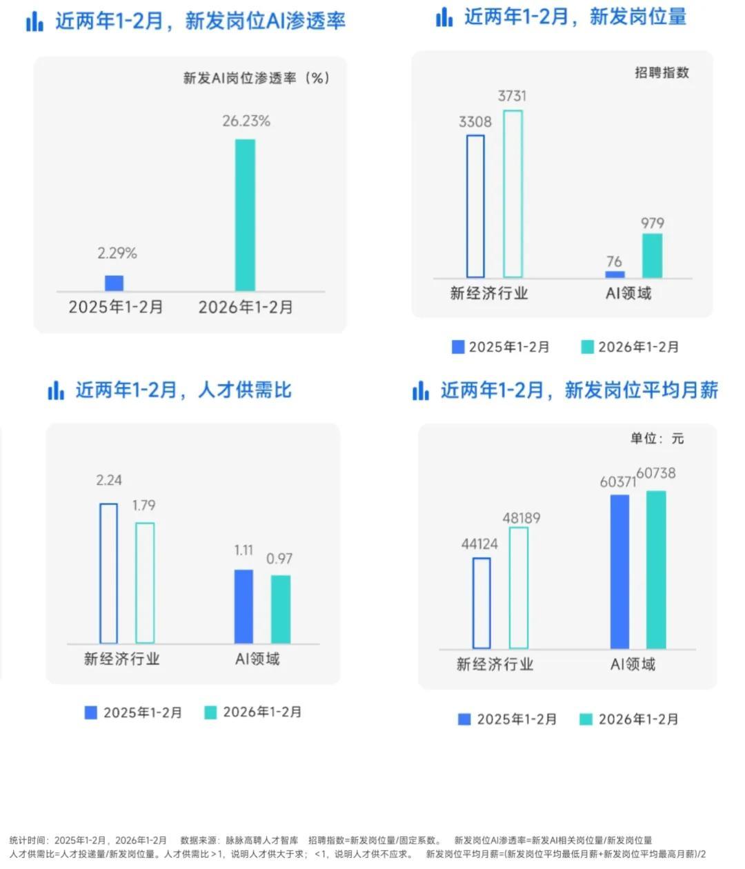 職場社區平臺脈脈近期發佈了《社交求職——2026年1—2月中高端人才求職招聘洞察》報告。報告稱,今年前兩個月,新經濟領域的AI崗位數量同比增長約12倍,在全部新經濟崗位中的佔比,從2.29%上升至26.23%。