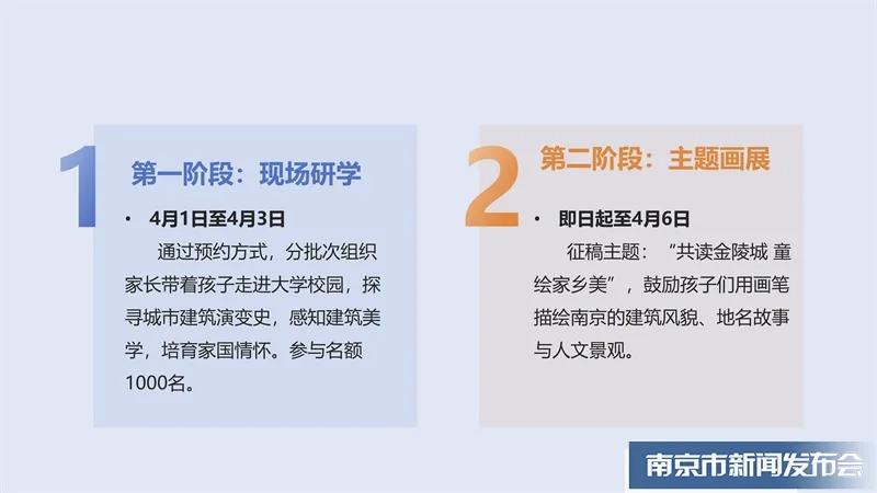 4月1日至4月3日,將通過預約方式,分批次組織家長帶着孩子走進大學校園,探尋城市建築演變史,感知建築美學,培育家國情懷。參與名額1000名。